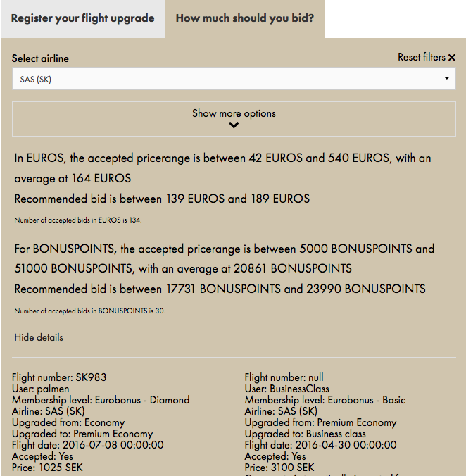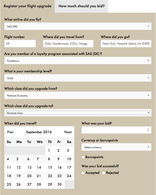 Hvorfor nu dette? Vi ved, at flyselskaberne tjener ganske godt på at du byder på en opgradering i en auktion, hvor du enten betaler med kolde kontanter eller med bonuspoints. Ved at du deler med os andre, hvor meget du ville give, og om det lykkedes dig at blive opgraderet eller ej, vil du hjælpe resten af os at spare penge eller bonuspoints næste gang vi står i den samme situation. Hvordan fungerer det? Vælg "register your flight" hvis du har forsøgt (enten det lykkedes eller ej) at opgradere din flyrejse. Fortæl, hvor mange penge eller bonuspoints du var parat til at give, og hvordan resultatet blev. Vælg "how much should you bid" hvis du allerede har bestilt en rejse, og du gerne vil give et bud på en opgradering. Men du vil gerne vide lidt om, hvor meget man sandsynligvis skal byde. GURU vil give dig et bud på, hvor meget du sandsynligvis skal byde for opgraderingen - i penge eller bonuspoints. Det er vigtigt at få nævnt, at de anbefalinger og vejledninger vi kan give dig bygger på statistik, og funktionen skal bruges med dette som rettesnor. Man kan aldrig garantere, at du kan få din opgradering til den pris du er parat til at give - der er så mange forhold, som kan gøre sig gældende i processen.