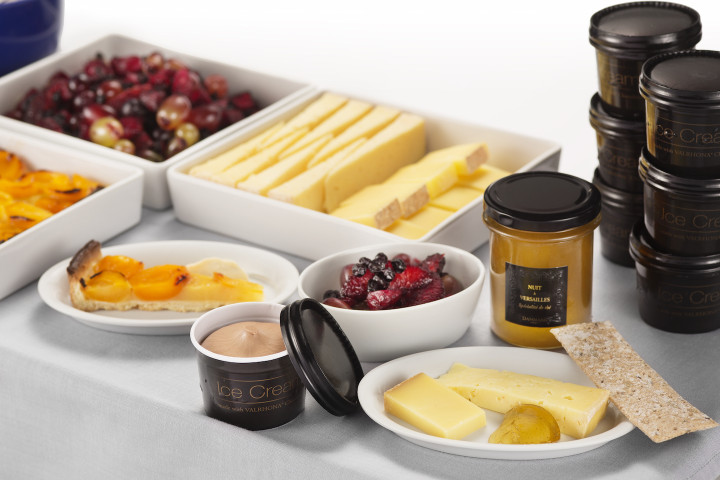 Dessertvognen med desserter, is, frugt og ost