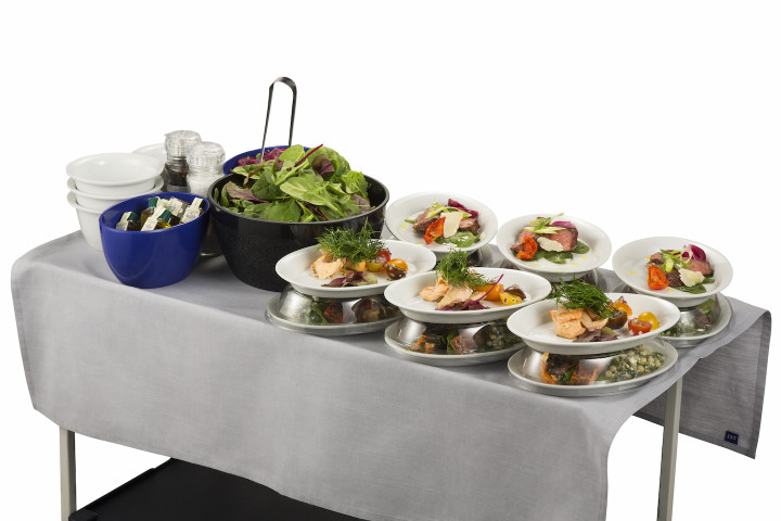 Serveringsvognen med forretter og salat Hovedretten serveres også fra serveringsvognen og nu vil der være fire forskellige valgmuligheder inklusive et vegetarisk alternativ. Maden vil i stor grad forblive skandinaviskinspireret og Gustaf fortæller at det er noget mange passagerer sætter pris på. Dette gælder også passagerer fra andre verdensdele som gerne vil smage det skandinaviske køkken når de flyver med SAS.