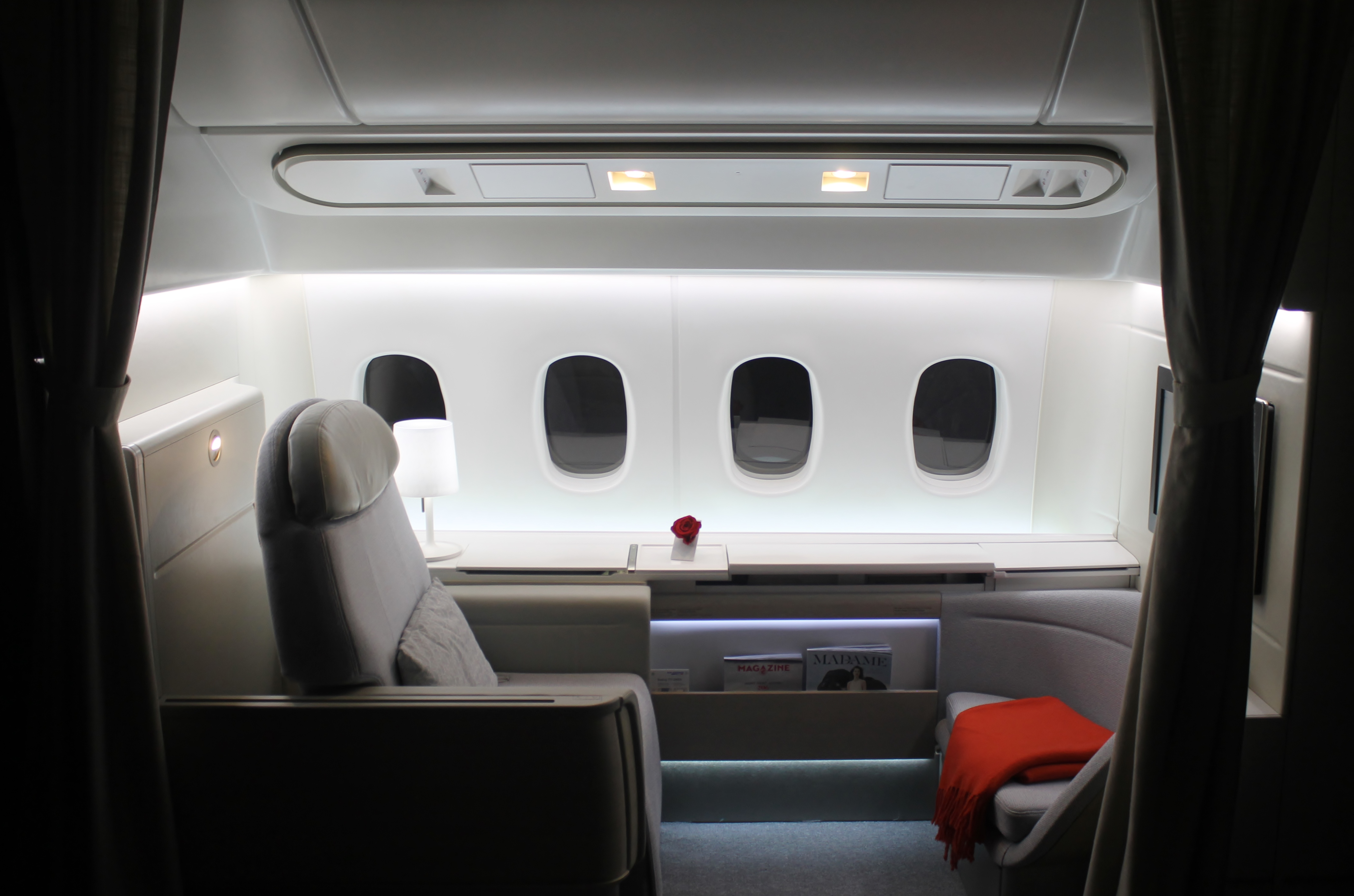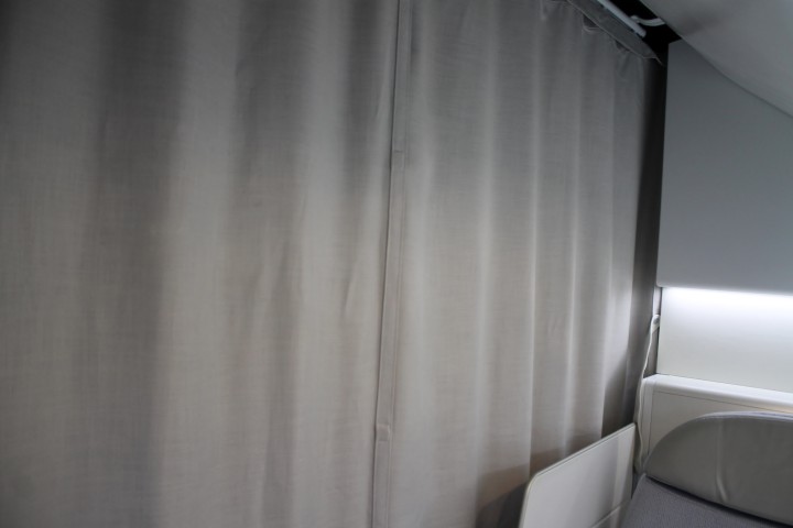 The preferred curtains in the suite To create a good sleeping experience, thick curtains are available next to each suite, which once drawn for the night create total seclusion from the cabin and the other passengers. During the rest of the flight, the curtains are attached to the wall, just like the traditional curtains between the different cabins. This is a concept that is unique to Air France and that has never before been tried in the industry. Today's La Première Suite is completely open with minimal privacy from other passengers. Catherine Betsch tells us that the curtains have been developed following requests from several travellers who asked for an open and airy floor plan onboard, without the feeling of being confined in their suite, while most want privacy when it is time to sleep. The new suite offers the best of both worlds. Coming to this solution, which also required approval by the authorities, was a very protracted process according to Betsch, but Air France was finally given the required certification.