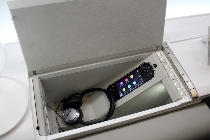 The remote control The remote control is stored in a hatch at the side of the seat. There are also power sockets, a USB socket and storage for the noise cancelling headphones. There are two control panels to control the seat functionality. To the side of the hatch there are hotkeys to quickly find preset seat positions. Should you wish to find a suitable seating position yourself, there are more buttons under the lid to the hatch. Both control panels are visible on the right in the picture below.