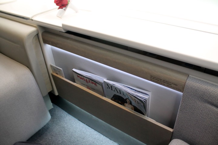 The nice ornamental lamp In front of the seat is an ottoman that can be used as a visitor's seat, for example if you have a travel companion and want to dine together. Otherwise the ottoman can be used as a footrest. Under the ottoman is a drawer where you can store your shoes, the same storage that is available under the ottoman in current La Première seats.