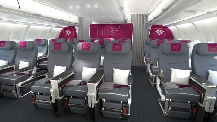 Eurowings Best There are 21 seats in Eurowings' Best cabin, three rows in a 2-3-2 configuration. Leg room is 45 inches (114 cm). The seat is basically the same seat that Lufthansa has in its new premium economy, but with a slightly different colour scheme. An example of some launch prices; the route Cologne-Dubai, from 99.99 EUR for Basic, 149.99 EUR for Smart, and 399.99 EUR for Best. Prices are one-way.