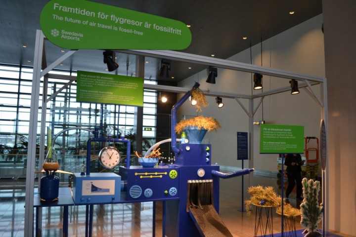 Alcohol-free lunch, since I was still "on-the-clock". But not for long.. Approximately one hour before scheduled departure we left the lounge to go through passport control and finally board the plane. Going through passport control in Arlanda usually takes no longer than 5 minutes unless you end up before the departure of a flight on Emirates or another airline from the Middle East. Even then, I never waited longer than 10 minutes (take that Heathrow, O'Hare and Charles de Gaules...).Before we got to passport control, we passed a large installation of the Swedish Airport Authority showing their vision of sustainable aviation fuel. Full disclosure, I work in research and policy on climate change and I actually know the environmental officer of SAS, KLM and a few other people in the Scandinavian Aviation Industry. Let me use this review to point out that flying obviously has a proportionally high environmental impact and that the best thing you can do to minimise your carbon footprint is to avoid flying or at least (like I do) offset the carbon emission caused by your travels (or encourage your company to do that). I use SAS own carbon offset program, but you can also use