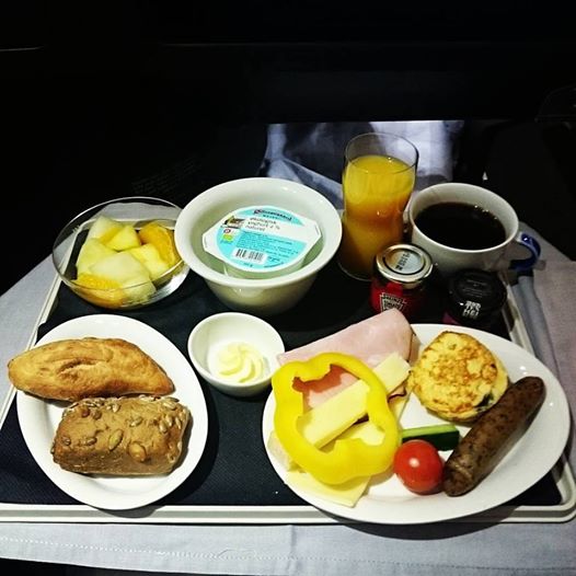 Around 1.40 before our arrival in Hong Kong (which was going to be 30 min before our schedule arrival time), the lights went off in the cabin and music was played to get us all back to life. The did not use the mood lightening during this flight, which is a shame because I was really looking forward to experiencing it, in particular since this as a night flight and I wanted to know if it actually would have an effect on me). Anyway, breakfast was served, and my gosh, a mighty breakfast it was. Sausages, yoghurt, fruits, muesli, you name it. The omelett was particularly delicious.