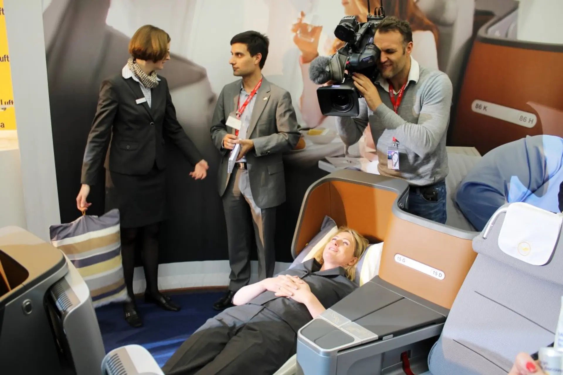 Lufthansa lanserar sin nya business class BusinessClass.se fick en personlig demonstration av stolen och dess funktionalitet av Lufthansas mycket kunniga produktchef. Hon var påtagligt förvånad att få träffa två personer som faktiskt kunde värdera data som stolens seat pitch (benutrymme) som i flygindustrin alltid anges i tum. Vi hade sällskap av ett reportageteam från CNN vars kvinnliga reporter verkade mycket belåten med den nya stolen