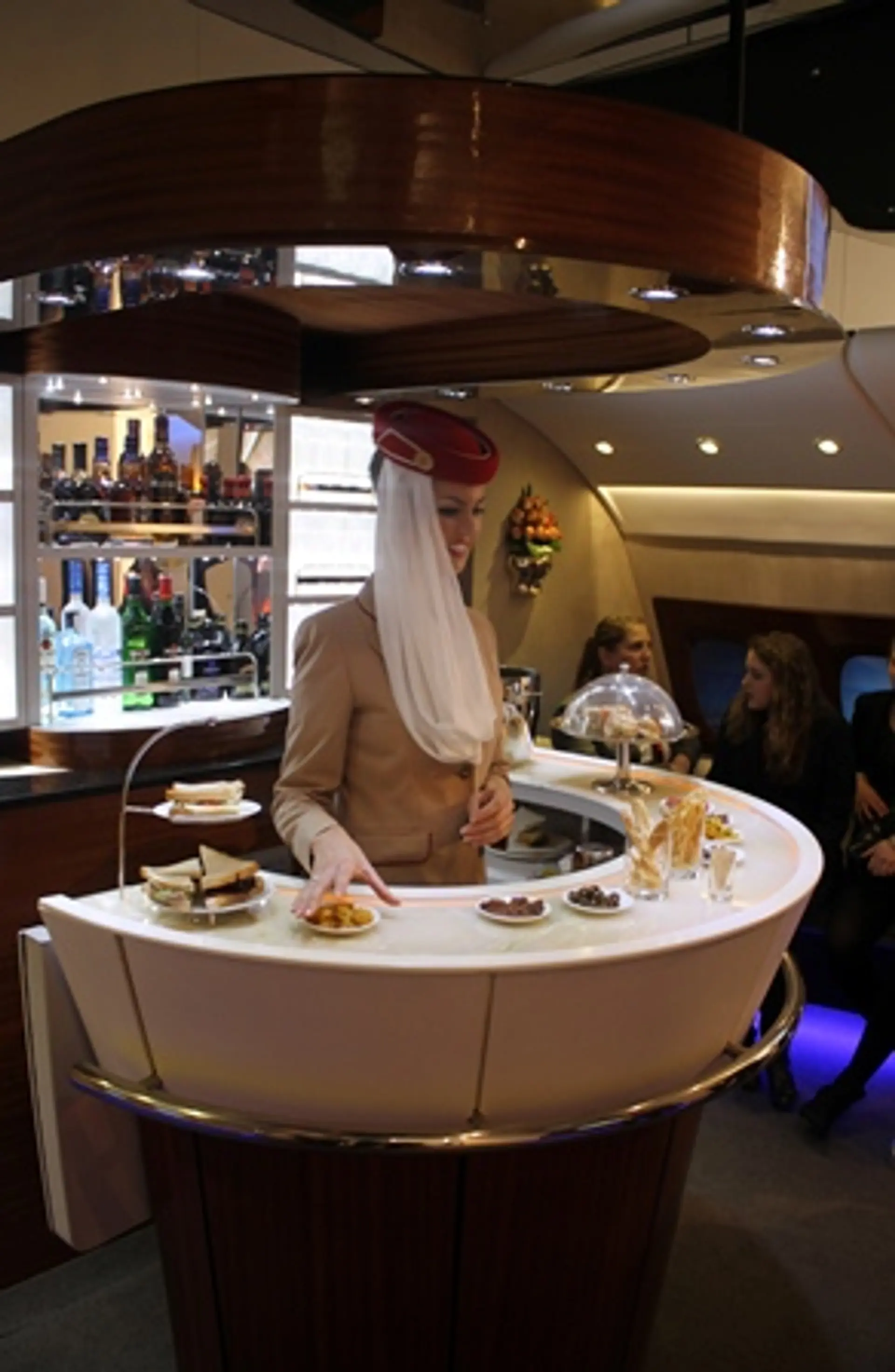 Emirates pampiga monter I montern fanns en fullskalig replika av första klass duschen på deras Airbus A380 samt business class baren i samma flygplan. Emirates första klass svit fanns även att testa, fullt fungerande. På övervåningen av montern fanns en stor möteslokal där man kunde boka möte med representanter på Emirates för att diskutera vidare.