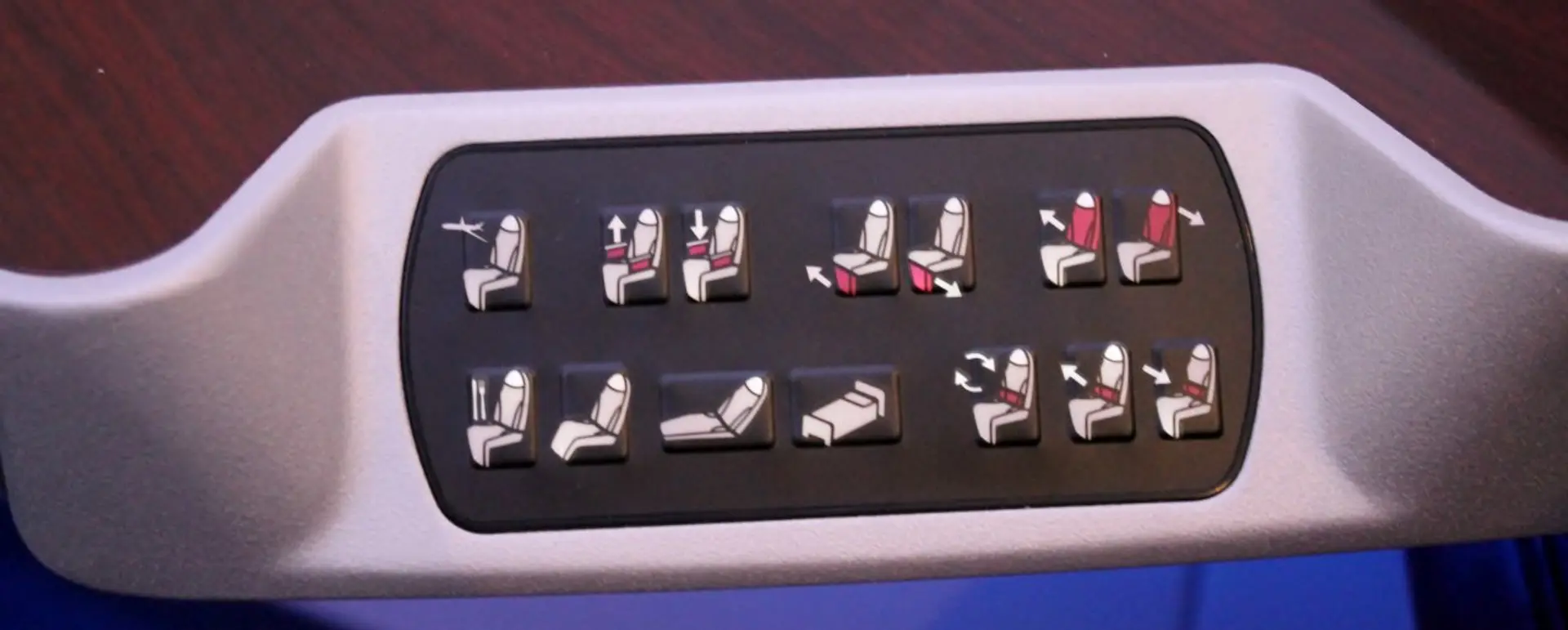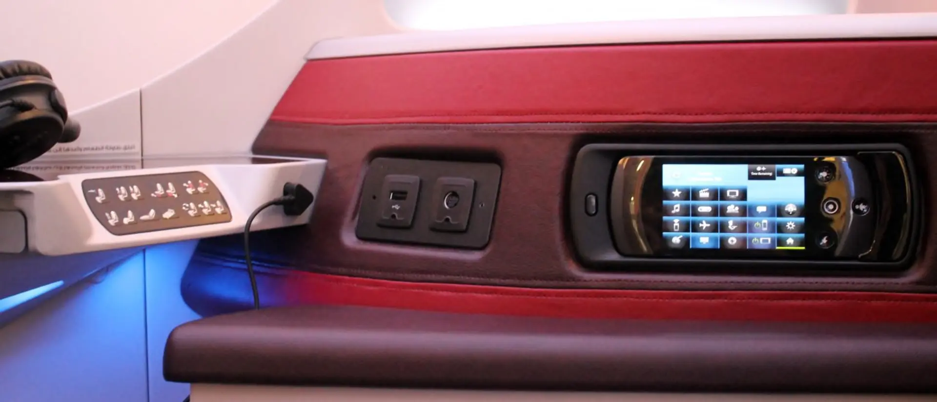 Qatar Airways nya business class på Boeing 787 Dreamliner Sätet har ett antal snabbknappar för att justera stolens läge samt möjlighet att justera svankstöd och aktivera massagefunktionen.