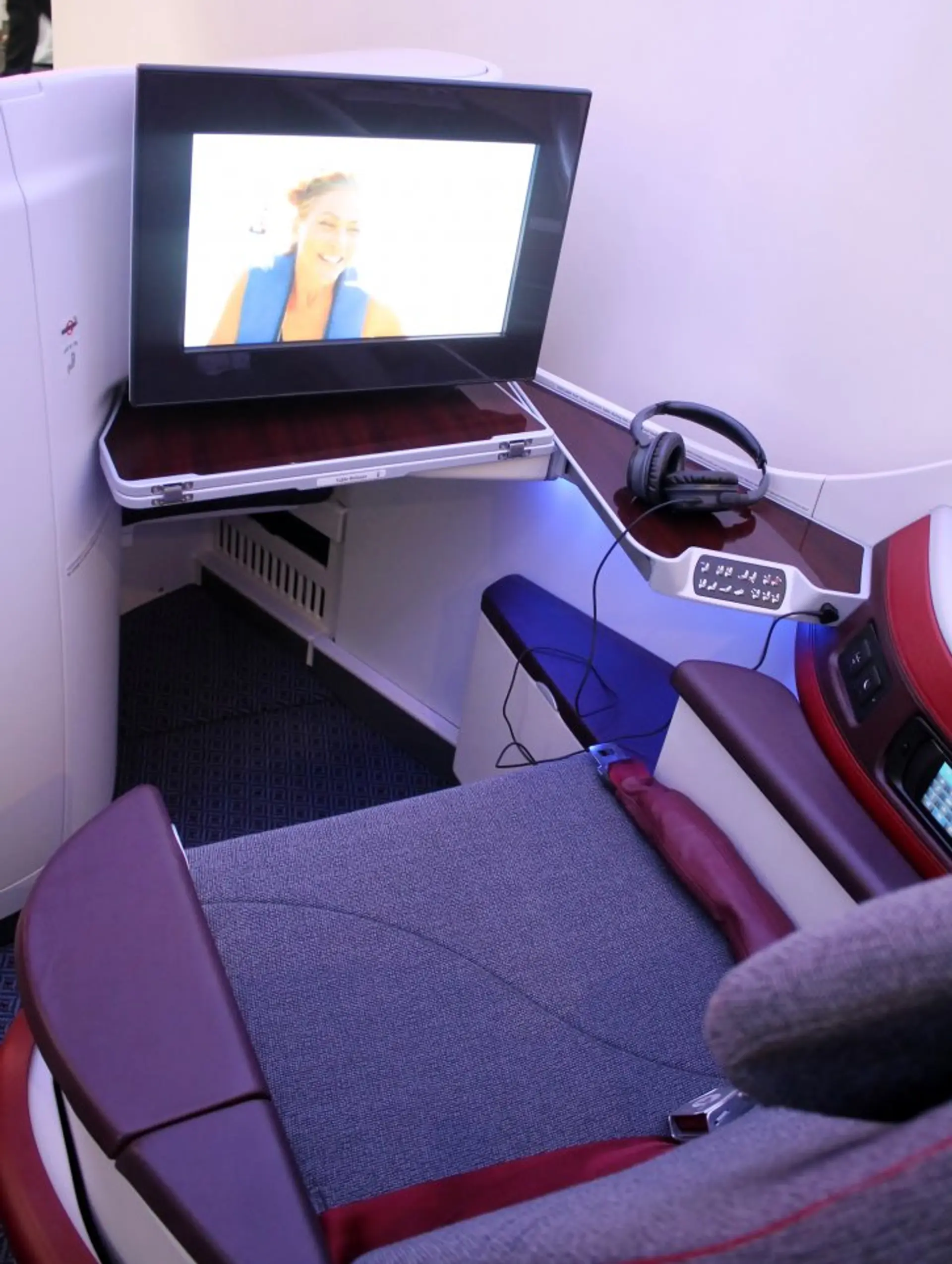 Qatar Airways nya business class på Boeing 787 Dreamliner När sätet är fällt till flatbed blir den två meter lång. På bilden syns hörlurarna av typen "Noice Cancelling" som påminde om Bose QuietComfort men var av annat (eget?) märke.