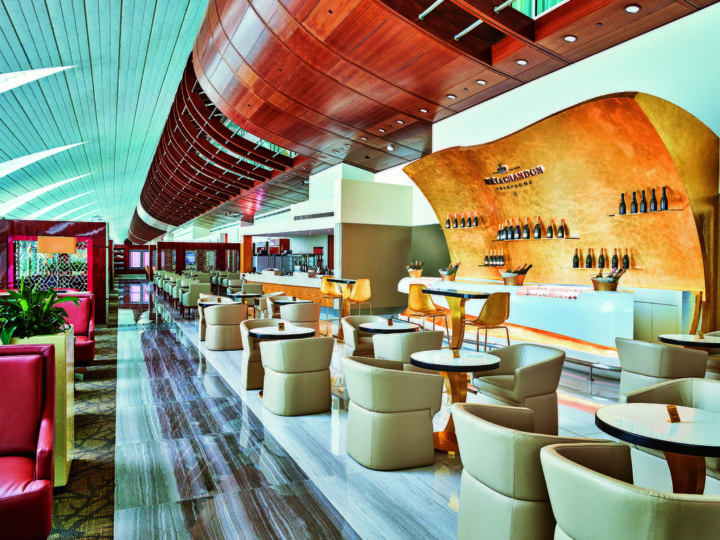 Från och med nu kanske ett par timmars väntan i Dubai inte gör så mycket: följ med in i flygbolagets nya business class-lounge. Vare sig du känner för att smutta på ett glas årgångschampagne, ladda upp batterierne med en smoothie eller njuta av en god kopp kaffe, kan den nya Emiratesloungen tillfredställa dina önskningar. Den ligger i avdelning B på Dubai International. Renoveringen har tagit två år och har kostat nästan ofattbara 100 miljoner kronor (enligt Emirates själva) och den redan stora loungen har utökats med tre nya områden för mat och dryck: en Moët & Chandon champagnelounge, en lite mer hälsoinriktad avdelning kallad Health Hub som man gör i samarbete med Voss (dyrt mineralvatten från Vatneström i Norge) och så har man också installerat en kaffelounge i samarbete med Costa Coffee. Moët & Chandon har länge varit en fast del av flygbolagets champagneurval, men sortimentet är nu antagligen det största någonsin. I avdelningen (som har utrustats med en elegant bar och små sittgrupper) kan man njuta av exempelvis Moët Impérial, Moët Rosé Impérial, Moët & Chandon Grand Vintage och Moët Nectar Impérial.