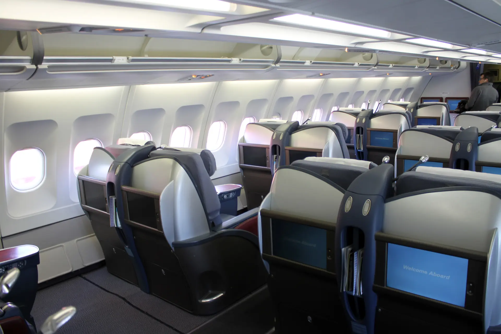 SAS kabinpersonal välkomnar ombord. Designen är elegant med stolar i ljusblått tyg och övrig inredning i grått och mörkblått. Det finns även detaljer i mahogny, exempelvis cocktailbordet mellan stolarna. Det kanske mest anmärkningsvärda är annars benutrymmet som ligger på 74-76 tum, att jämföra med SAS normala business class som ligger på 61-62 tum. Det är en avsevärd skillnad och det är ganska ovanligt med så mycket benutrymme i business class, i alla fall såvida inte någon av de nyare kabinuppläggen används. Exempelvis med fiskbenskonfiguration eller sicksackkonfiguration finns ofta liknande benutrymme men då kan denna tas igen på olika sätt i designen.