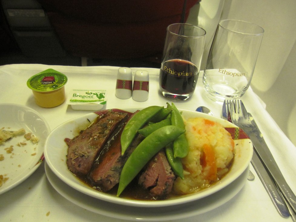Efter att ha druckit upp mitt glas med champagne fick jag frågan om jag ville ha lite vin till maten, vilket jag glatt sade ja till. De hade två röda viner ombord som serverades ur stora flaskor. Flygvärdinnan var snabbt vid min plats och lät mig få titta på flaskorna och jag valde den franska Châteauneuf du Pape. Hon sprang tillbaka till galleyt, öppnade flaskan, och var kort därefter tillbaka vid min plats och elegant lät mig provsmaka vinet medan flaskan hölls upp framför mig. Vinet smakade mycket bra och serveringen av dryckerna (ja hela serveringen faktiskt) skedde med den där extra finessen som är så kul att få uppleva ombord men som långt ifrån alla flygbolag faktiskt klarar av. Det hade jag inte alls väntat mig av Ethiopian Airlines. Det fanns tre val av huvudrätt: fisk, lamm eller biff. Jag valde lamm som serverades med någon typ av potatismos och grönsaker. Det smakade fantastiskt bra och portionen var väl tilltagen.