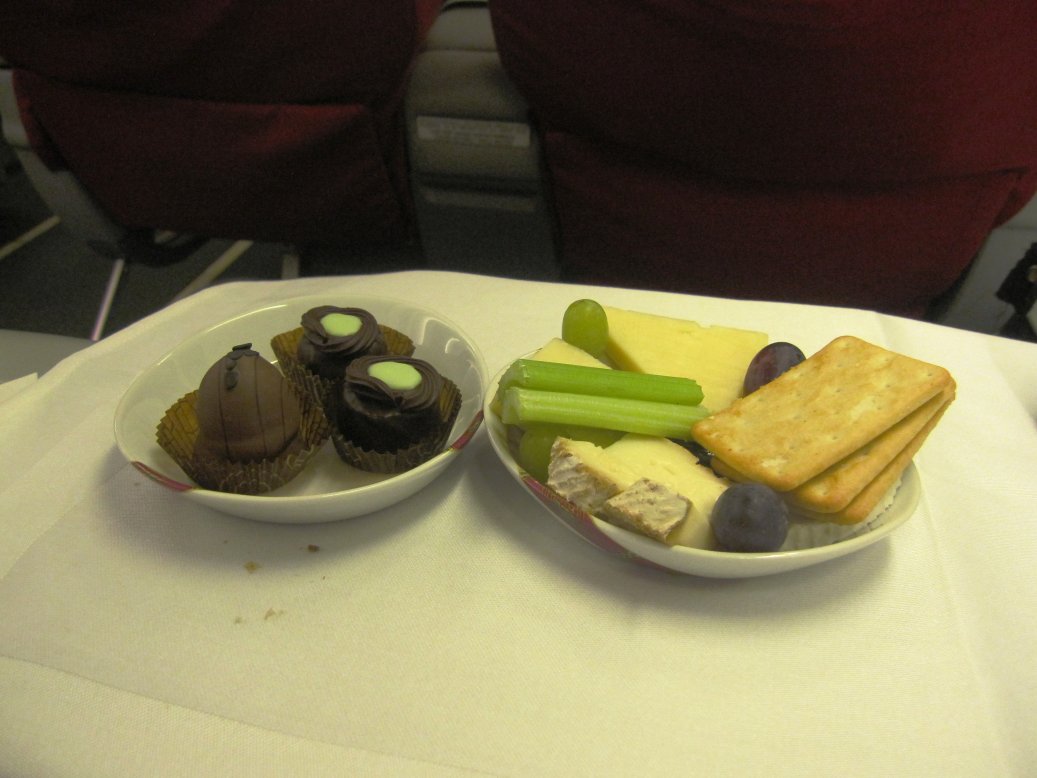 Men ännu var det inte klart. Jag blev erbjuden en väl tilltagen osttallrik som var svår att motstå med kex, vindruvor och grönsaker. Kort därefter blev jag även erbjuden chokladpraliner på ett fat. Tre stora chokladpraliner fanns fatet varav två var med marsipan. Vansinnigt goda. Jag blev slutligen erbjuden kaffe eller te och det fick bli en välbehövlig kopp svart kaffe för att piggna till. Jag bad även att få en whisky för att avrunda måltiden. De hade två sorter att välja mellan: Johnnie Walker Black Label och Chivas Regal och det fick bli ett glas av den sistnämnda.
