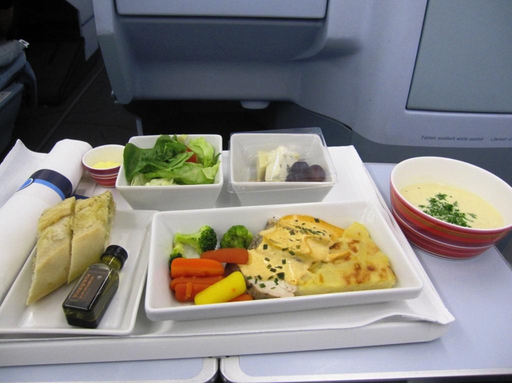 Hela måltiden serverades samtidigt med soppa (frivilligt) samt tre val av huvudrätt. Det gjorde att det blev en ganska snabb och effektiv måltid vilket uppskattades med tanke på att klockan redan var efter midnatt. Som förrätt serverades sallad samt en god kantarellsoppa. Som huvudrätt valde jag filén med potatisgratäng vilket också smakade mycket bra. Varmt bröd serverades av kabinpersonalen och på brickan fanns både smör och olivolja. Ett bra utbud av drycker fanns ombord och vinerna förvarades på ett ställ vid sidan av serveringsvagnen så man själv kunde se vilka sorter som fanns (de fanns givetvis även beskrivna i drinklistan). Jag valde ett gott italienskt Chiantivin och blev senare erbjuden påfyllning.