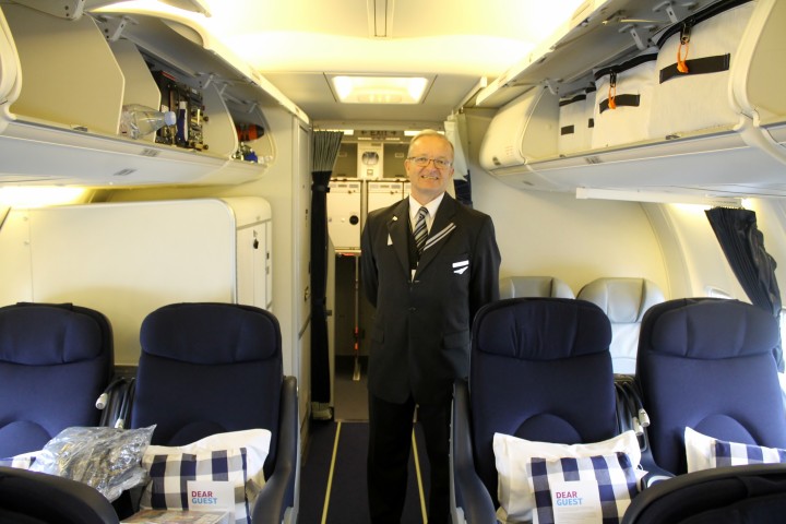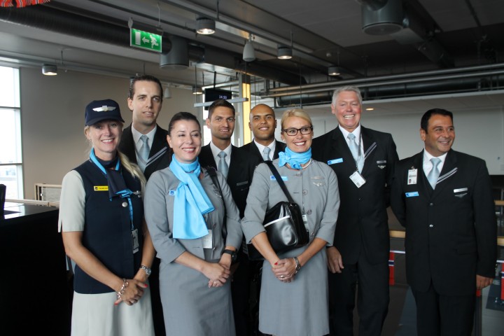 Glad kabinbesättning från SAS och Privatair På varje flygning finns två piloter samt fyra i kabinbesättningen. På invigningsturen finns dessutom en femte besättningsmedlem som är SAS-anställd och som är med ombord för att ge lite extra service.