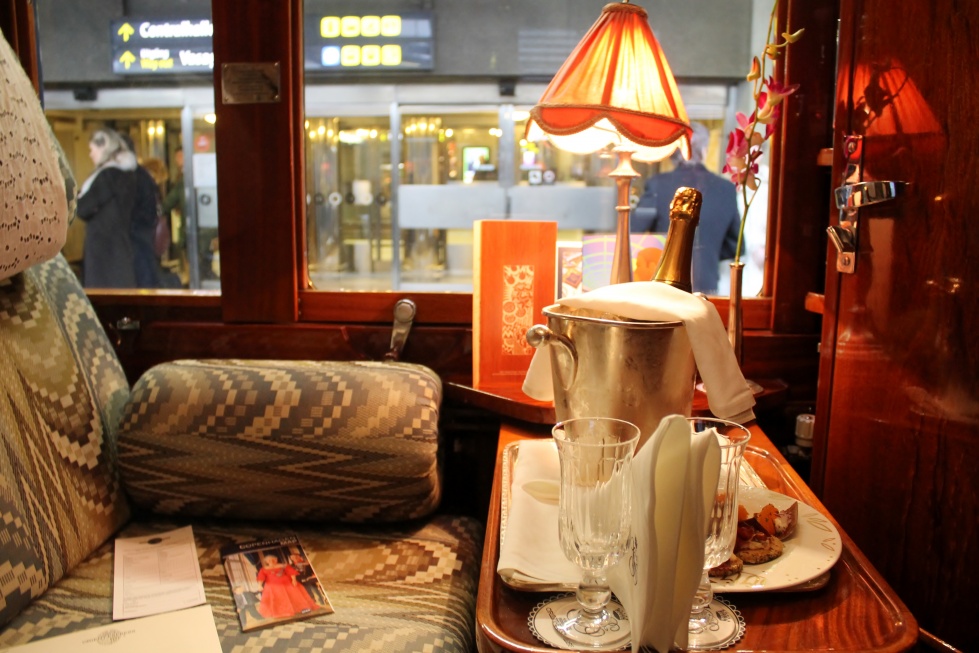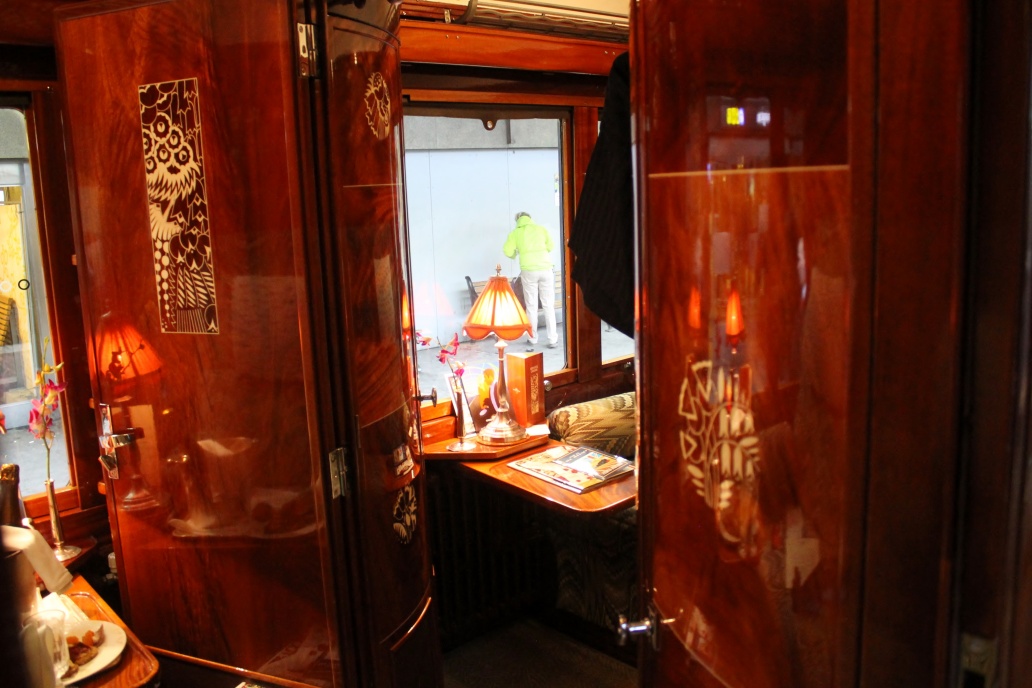 Efter att ha låtit mig imponeras av restaurangvagnarna var det hög tid att kliva in i sovvagnarna. Sovvagnarna hyste rum för nio tvåbäddskupéer, alternativt fyra sviter. Det som på Orientexpressen kallas för svit handlar i all ärlighet om två hopslagna dubbelkupéer. Interiören var byggd i uteslutande mahogny, medan sängarna klätts i finaste silke. I den första svit vi fick tillfälle att blicka in i hade en passagerare haft den goda smaken att beställa in en kyld flaska Champagne.