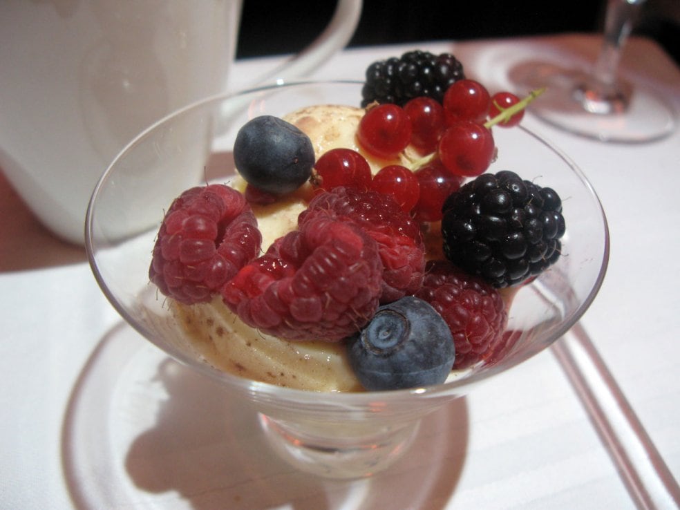 Desserten var en elegant servering av Häagen-Dazs vaniljglass med färska bär, samt färsk frukt med len vaniljsås.