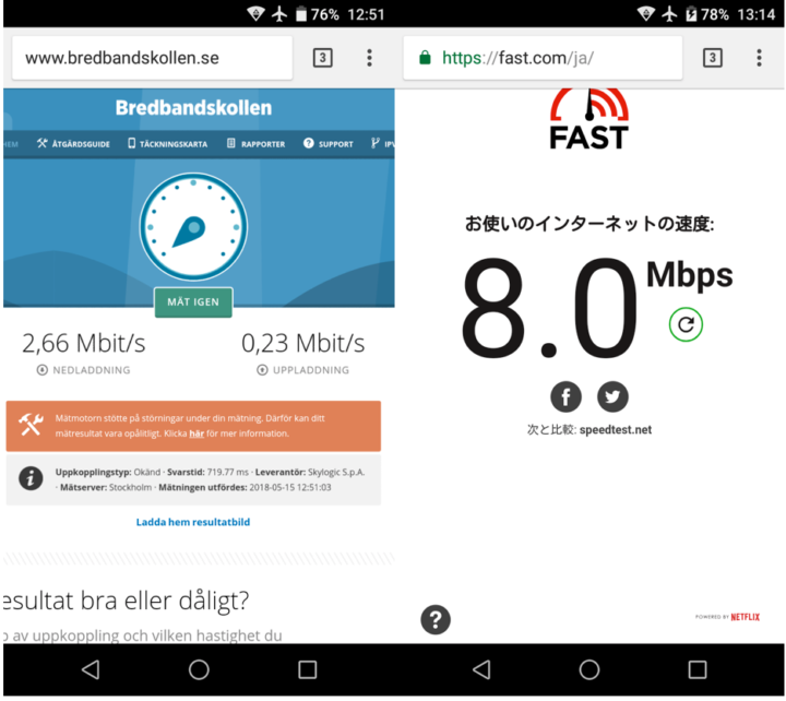 Mätningspunkt Sverige: nedladdning 2,66 Mbps, uppladdning 0,23 Mbps