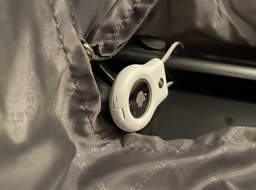 Tänkte att det var dags att fixa AirTags innan första utlandsresan på 2 år. Skaffade en Belkin-hållare (länk) som har en stålvajer som man skruvar fast i en plasthållare med AirTag:en. Jag tänker mig att detta borde krångla till det ordentligt för en eventuell tjuv... Sedan skruvade jag fast den under tyget i själva stålramen, så den ligger helt dold och borde inte resultera i en allt för omfattande signalstörning på grund av väskan.