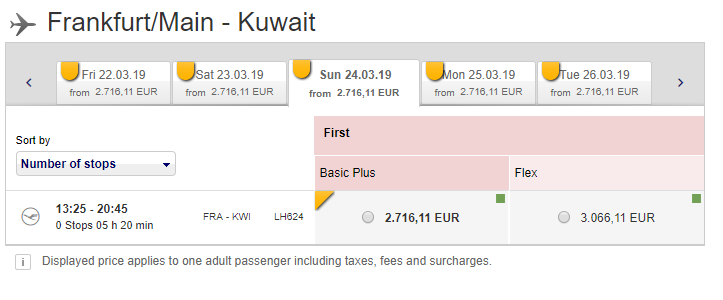 LH624 FRA Frankfurt - KWI Kuwait flygs med A340-600 med First Class till salu.