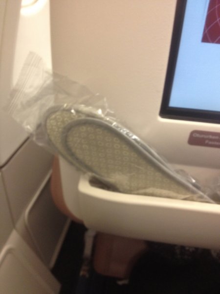 Olika sorters välkomstjuicer bärs ut på brickor och i stolsfickorna framför så hittar vi tofflor och necessär från Porsche Design. Plus i kanten för sockiplasträfflade undersidor på sockorna.