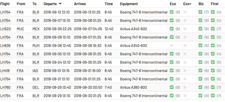 Finns just nu 99 flighter mellan idag och 25 november, där tillgängligheten är minst 4 platser i First.