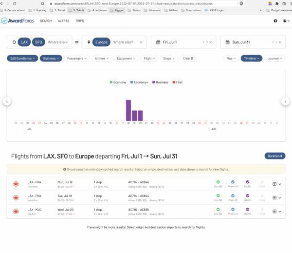 Testa sök ben för ben om du inte redan gör det. Dvs sök inte hela vägen direkt utan t.ex FRA-LAX först och hittar du tillgänglighet där så letar du upp en lämplig anslutning från ARN. Som sagt, om du nu inte redan gör det.Söker efter resa med Star Alliance för att använda EB poäng med 2-4-1. Har inför tidigare lyckade bokningar 2-4-1 sökt tillgänglighet med Award Nexus och som har stämt ganska bra med vad som funnits tillgängligt när jag ringt in och bokat vida gamla Tallin eller SAS kundtjänst. Jag har aldrig tidigare sökt resor via SAS Star Alliance sökmotor och är nybörjare med verktyget, men har försökt läsa här på forumet hur man kan söka och testat på olika sätt. Söker nu efter resa ARN-SFO/LAX i sommar och det finns ingen tillgänglighet alls när man kollar SAS sökmotor. Söker på olika sätt, via hubbar som FRA, MUC, LHT, ZUR etc. Har uppfattat att om det är mixed cabin så visar SAS bara Economy. Tillgängligheten stämmer inte alls med vad som finns på Award Nexus. Min frågar är; missar jag något i hur jag söker, eller har SAS utbud för bokningar med Star Alliance försämrats/minskat så påtagligt? Eller är minskad tillgänglighet en konsekvens av pandemi och färre flighter och är övergående? Men om det är det sistnämnda så förklarar det ju inte diskrepans i tillgänglighet mellan SAS Star Alliance sökmotor och Award Nexus. Har gjort flera HUACA när agenter inte ser tillgänglighet utan resultat. Tacksam för input!