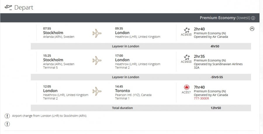 Jag försöker hitta något ställe att kontakta Air Canada om ovanstående på hemsidan men det verkar som de inte är villiga att hjälpa till med framtida bokningar. Kan någon förstå varför bokningen för utresan ser ut som ovan?