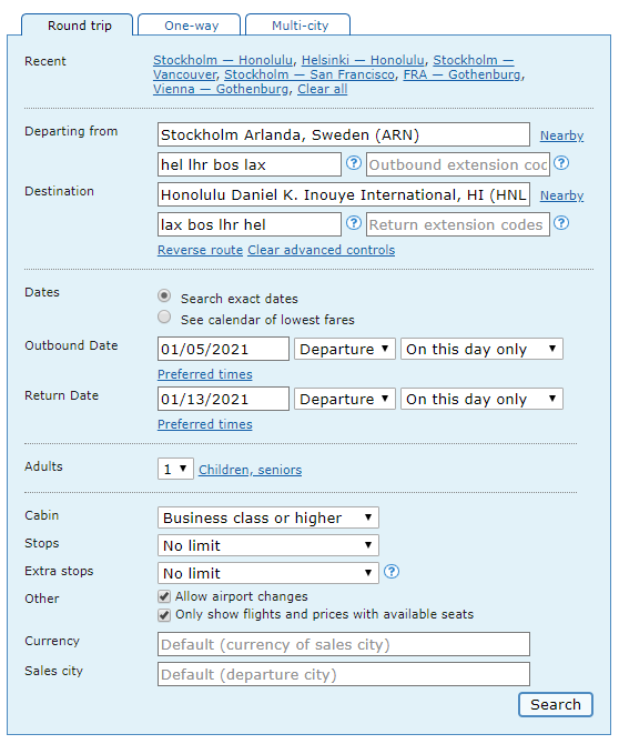Exempelvis: ARN-HEL-LHR-LAX-HNL-LAX-BOS-LHR-HEL-ARN
