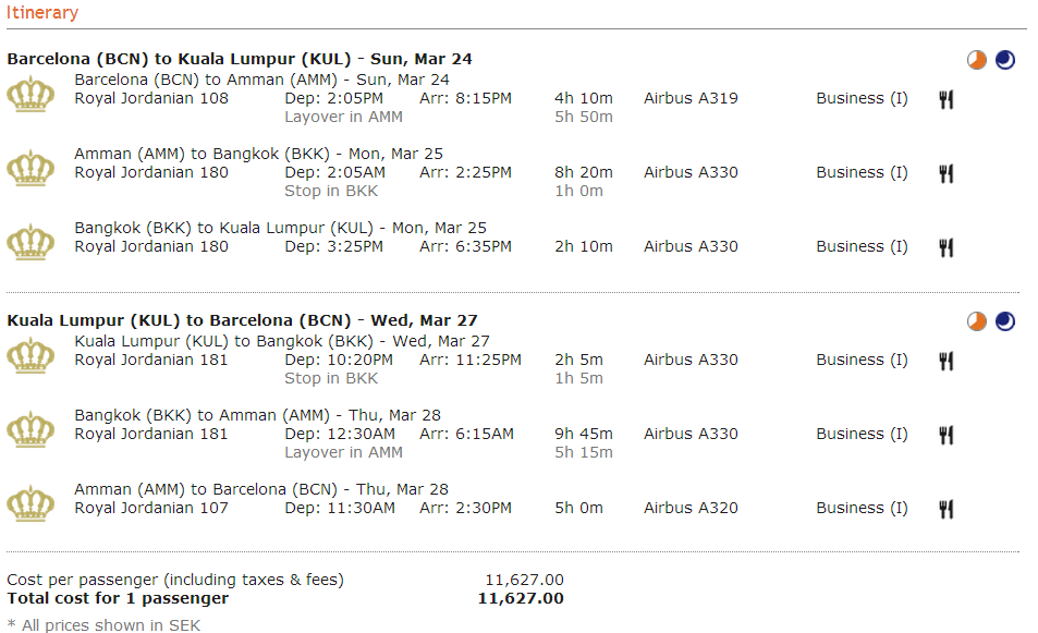 [Business Class] Madrid/Barcelona-Bangkok/Kuala Lumpur - 11.700 SEK, Royal Jordanian