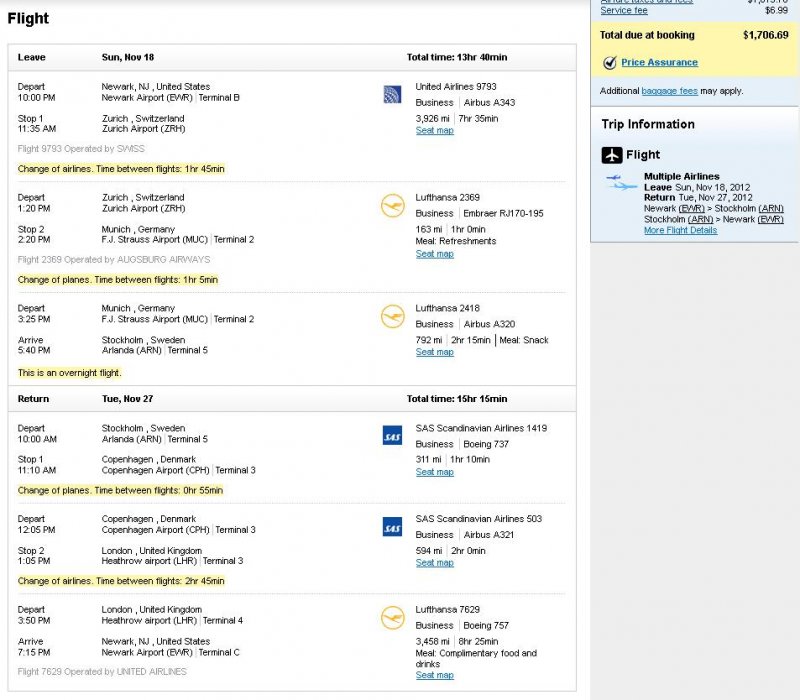 Jag inser nu att jag gjorde en liten tabbe: bokade i en klass som ger 0 eller 0.5 miles hos de flesta program. Men räknar jag om miles/pengar ratio så hamnar jag på 2dygn+$530 till min fördel jämfört med biz alternativet. Pengamässigt är det inte så mycket men hur ska man värdera 2 semesterdagar? Så om du tycker att du kan vara mer flexibel med tiden då är det fortfarande en bra deal.