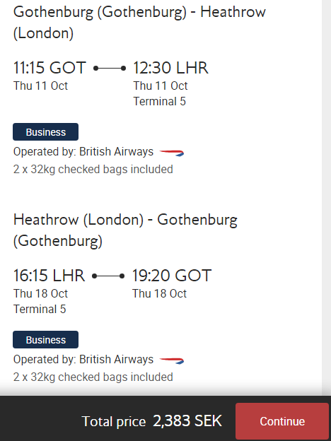 [Business class] Stockholm/Göteborg-London T/R, British Airways, från 2.400 SEK inkl. skatter