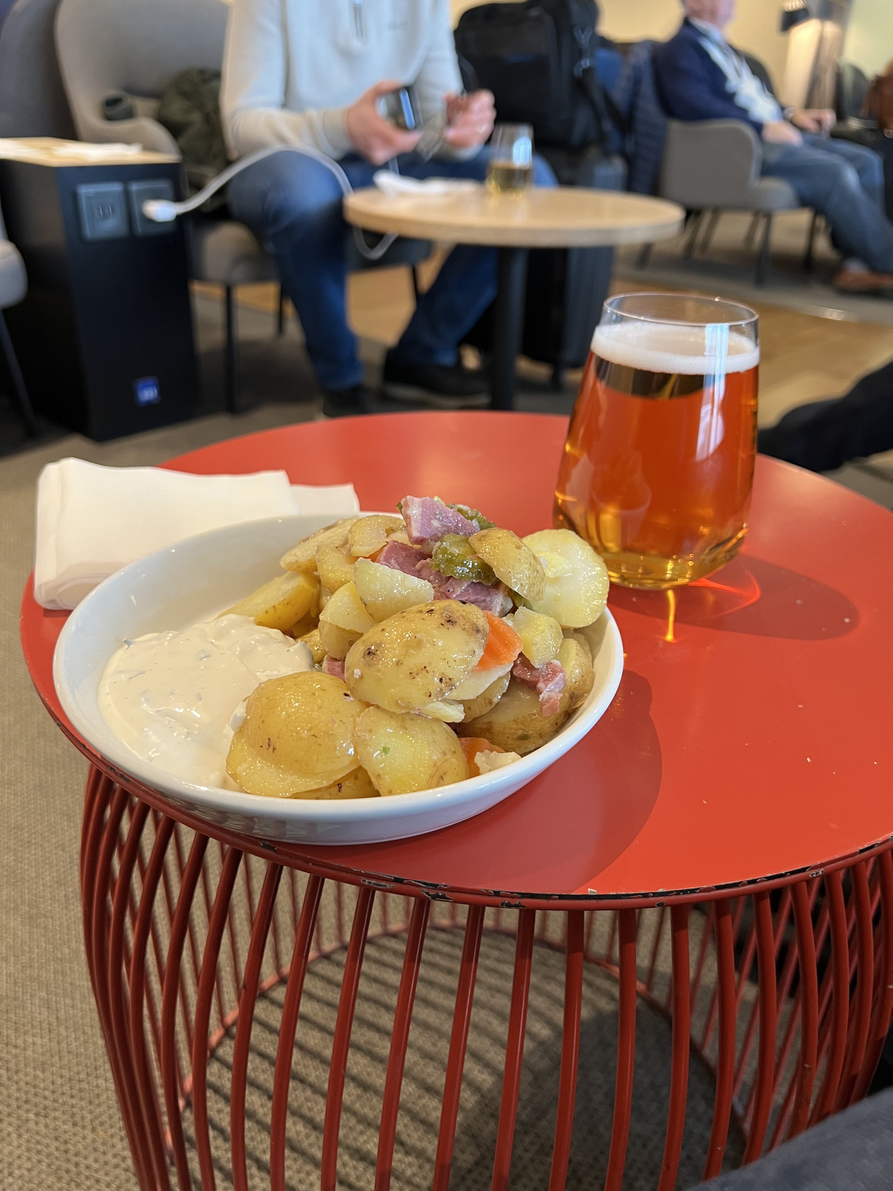 Hälsningar från en välbesatt Aegean-lounge på ATH terminal B (Schengen). Här finns ett bra urval av både kallt och varmt. Gästade först in en person i Skyserv (en PP-lounge) innan jag tog den andra gästen hit. Där var det nästan inga, men såg ut att vara enbart kallt som erbjuds. Dock såg den klart bättre ut än jag hade trott baserat på de mediokra omdömena jag sett på nätet. Lufthansa (som tydligen har en väldigt liten lounge) hade en loungedrake utanför dörren som verkade skicka iväg de som inte flög med deras egna plan, så där försökte jag inte ens.