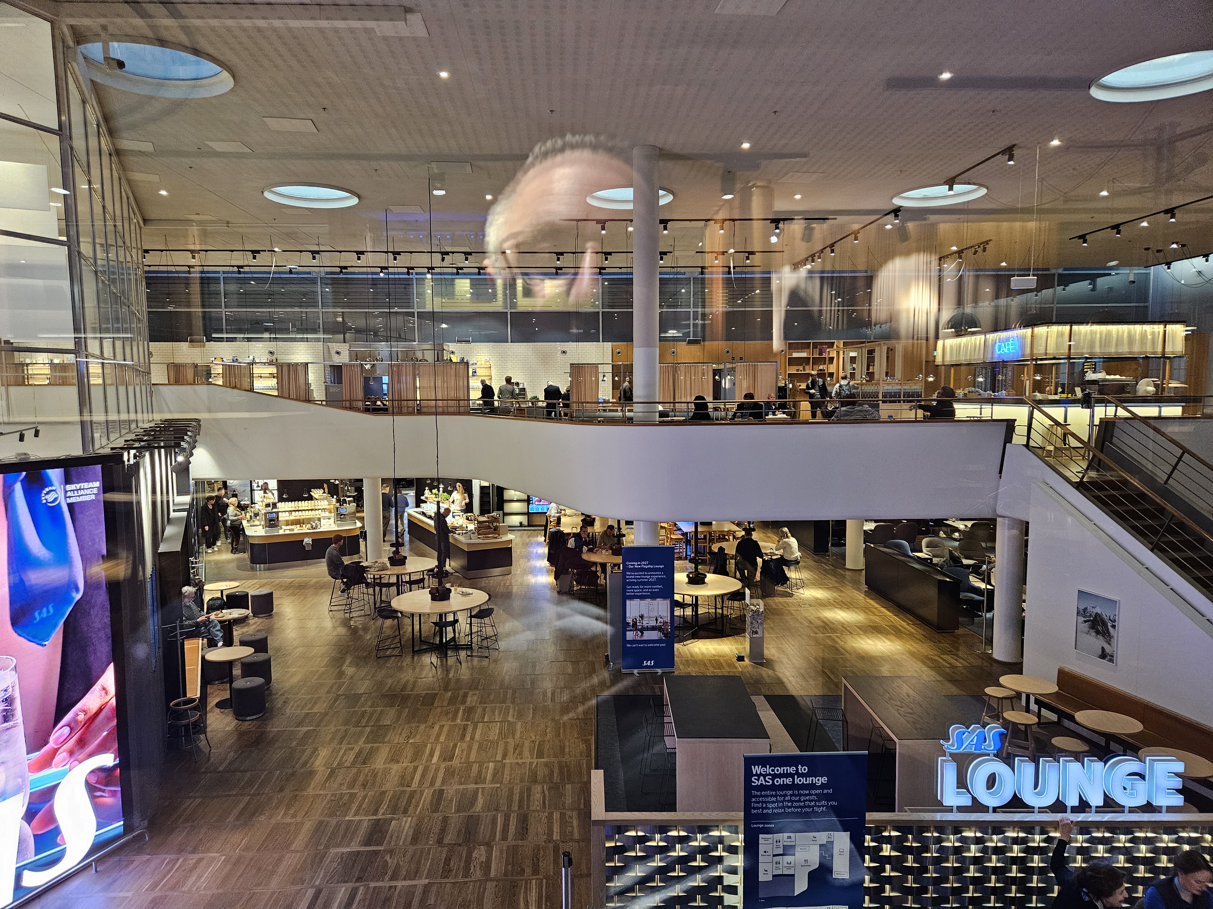 Ett litet tips från min "favo" loungevärdinna är om man sitter på 2:a våningen är att ta vänster ner för trappan dvs om man vill till de starkare dryckerna för att slippa gå ut/in genom automatiska dörrarna.