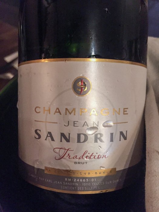 Precis... man får ju alltid ta priset i beaktande vid omdöme...Denna billiga (kommer inte exakt ihåg men vet att det var en bit under €20, tror kanske €17) 100% Pinot Noir-champagne från Jean Sandrin är ganska trevlig. Inget särskilt men för priset är det bra ”bang for the buck”. Trevlig doft av röda frukter och väldigt trevliga små bubblor och även om de saknar lite längd och fyllighet så funkar den bra som aperetif.