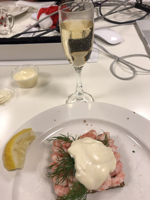 trevligt arbetsplats med smörrebröd och bubbliga drycker.