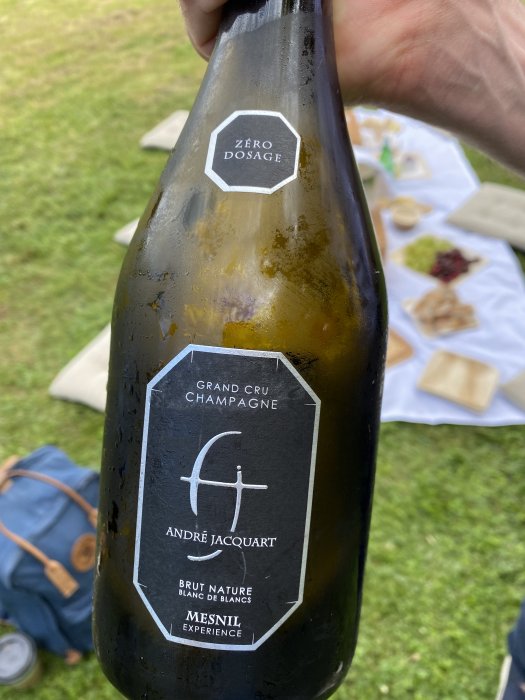 Fantastiskt trevlig champagnepicknick igår. Inledde med en trevlig enklare champagne från Jacquart (inte det stora kooperativet som säljer medelmåttig champagne utan den lilla odlaren André Jacquart). Är perfekt att inleda med.