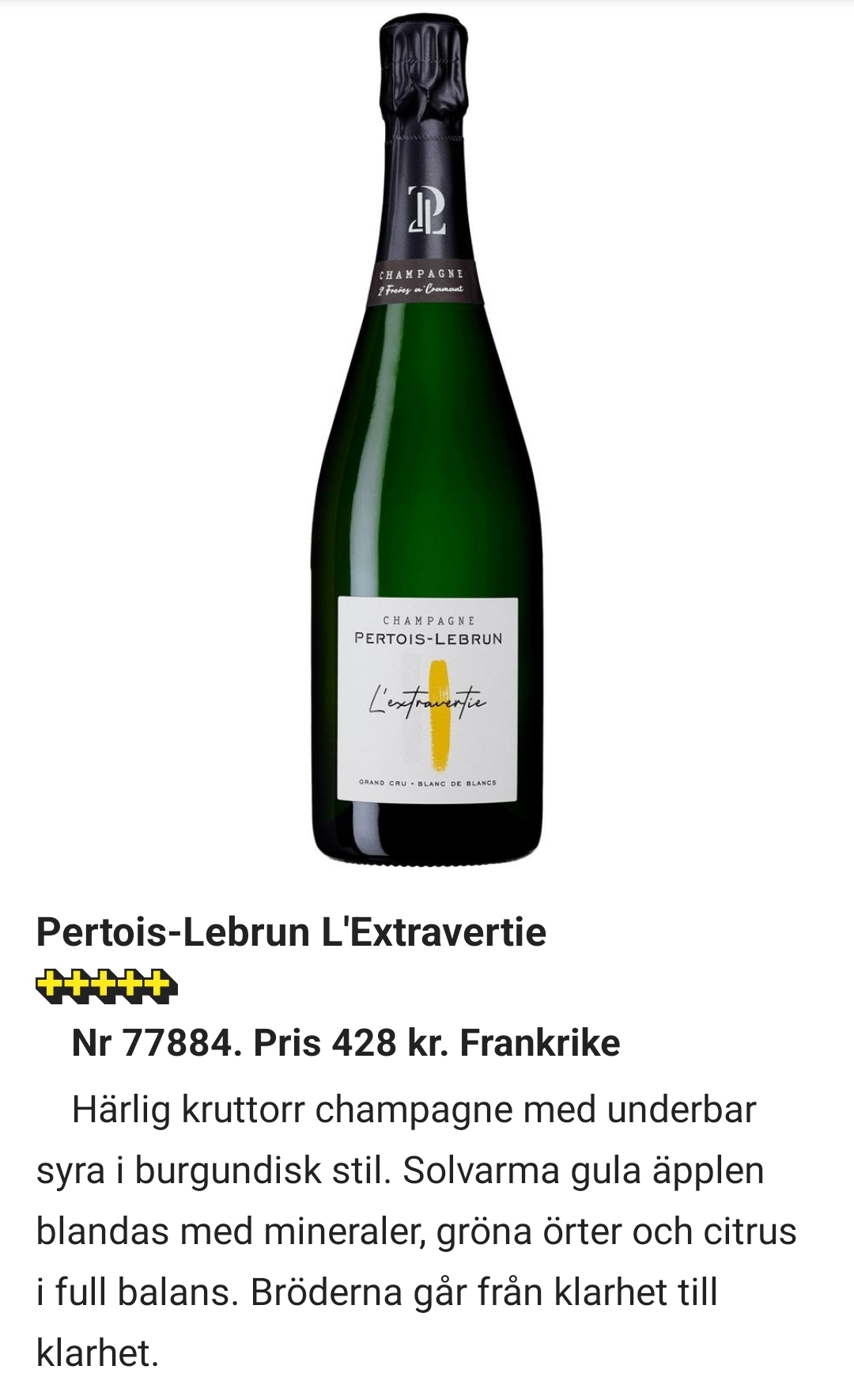 Komplex smak med många härliga toner och fint mousse. Den har legat i topp på många listor och jag blev själv helt såld när jag testade den på en provning. För 399kr är den ett kap.
