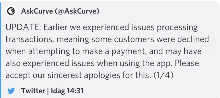 Vad var det dom ställde till med då? Jo, Curve utförde själva skiftet av kort i appen helt plötsligt och utan förvarning. Trots att det via mail meddelats att man skulle kunna fortsätta att använda sitt aktuella kort tills man hade fått det nya hemskickat och själv aktiverade det i appen. (Så går det ju alltid till vid byte av kort!) Och något nytt kort hade inte jag fått.