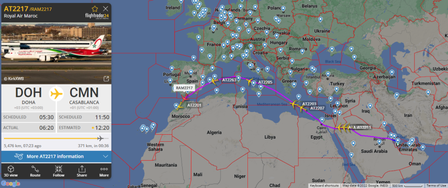 Både Qatar Airways och Royal Air Maroc körde förstås i båda riktningarna, Marocko hade hyrt in 5-6 plan från Wamos Air bl.a.Nu lär det väl varit fler plan än så i farten, men intressant att det enbart är Qatar Airways-plan dit och Royal Air Maroc-plan hem. Det är väl inte en allt för avlägsen gissning att Qatar Airways bjuder på resan hem för vinnarlaget nästa vecka?