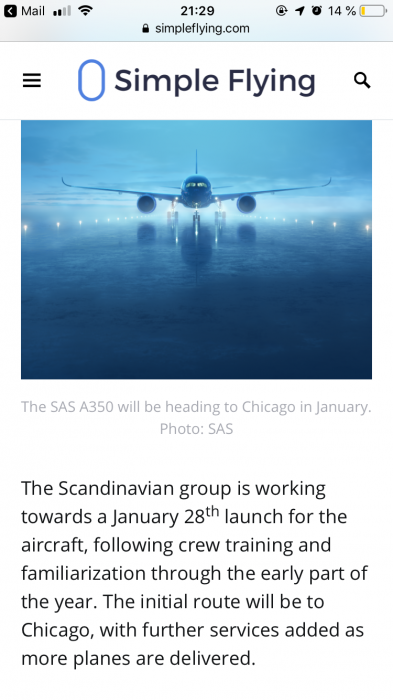 Datum fastställt för SAS A350 första ordinarie avgång, Köpenhamn-Chicago 28 januari 2020
