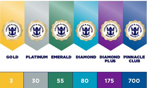 Royal Caribbeans lojalitetsprogram Crown & Anchor har förmodligen flest nivåer. Alla blir Gold som registrerar sig vid första kryssningen. Under de sju år jag varit medlem har det blivit svårare och svårare att uppnå högre status och nivåerna har blivit fler. Det beror på att antalet återkommande kryssningsresenärer stadigt ökar och att det finns amerikanska seniorer vilka uppnått mer än 100 kryssningar och som i princip "bor" på kryssningsfartygen.