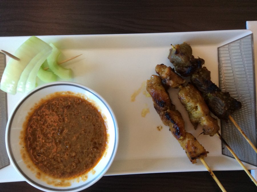 Serveras lite tilltugg före middagen, bestående av kyckling och lammspett