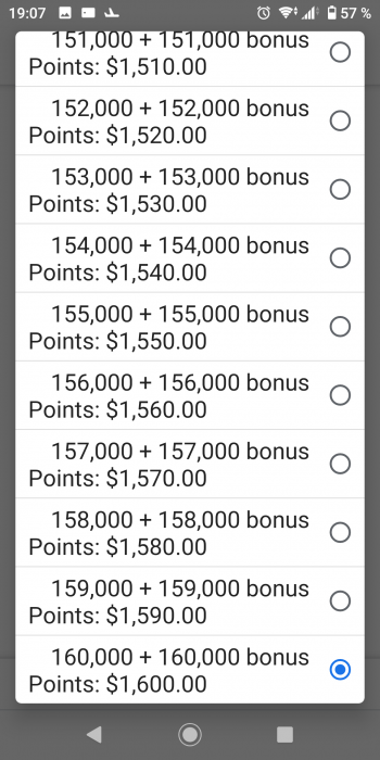 160.000p för $800 ($0,005 per poäng) kan vara värt om man t.ex. saknar 160.000p för att få in "5th night free" på hotell som kostar mycket i rena pengar (Conrad, Maldiverna $5,589.40 för 5nätter) men där poäng per natt är runt 95.000p (4 nätter = 380.000p). I detta exempel är ju $800 värsta kapet.