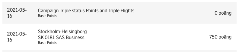 Jag lägger märke till att när jag flög Plus till Ängelholm under 4x kampanjen och fick fler statuspoäng, står det sedan tidigare att jag flög Business till Helsingborg, och nu är det tillagt att jag gjorde det under en triple points-kampanj och fick 0 poäng. Men i övrigt är det ju helt rätt (flygbolag, datum och flightnummer).