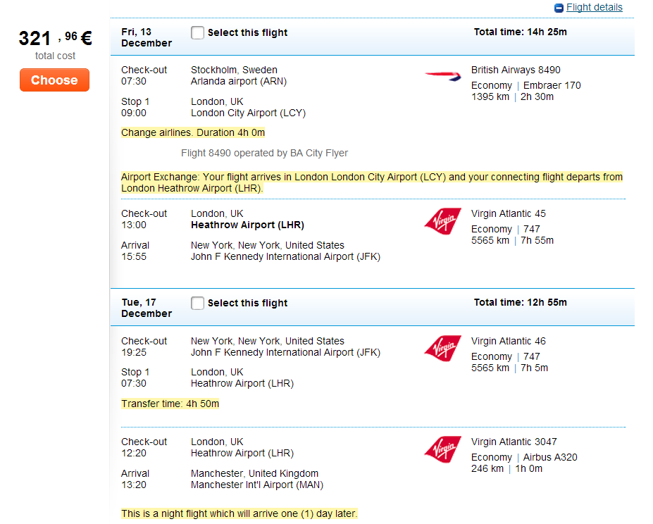 Notera flygplatsbyte i London på ditvägen på just detta exempel. Det går dock alldeles utmärkt att åka ARN-LHR såg jag nu i efterhand för samma pris.