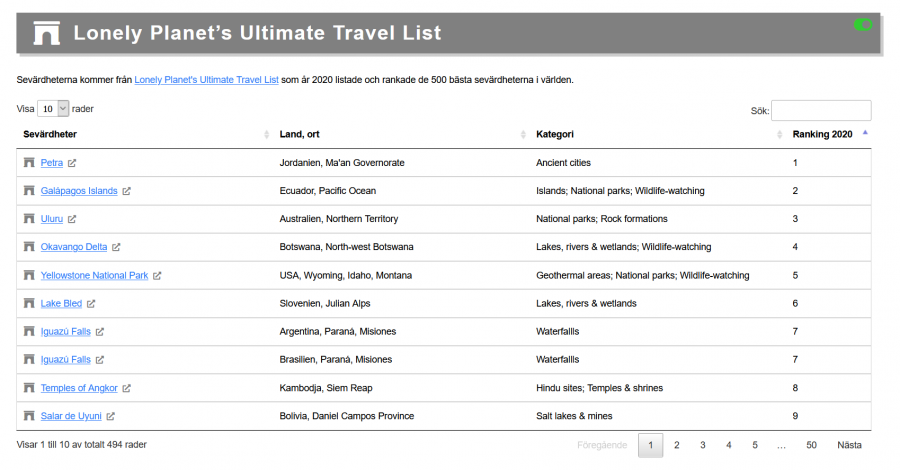 Redan inne och rotat. En fråga, skulle det kunna gå att filtrera på stad under "Lonely Planet's Ultimate Travel List"? Eller är det kanske överflödigt? Tänker om listan kanske blir för stor att jobba med pga för många alternativ.