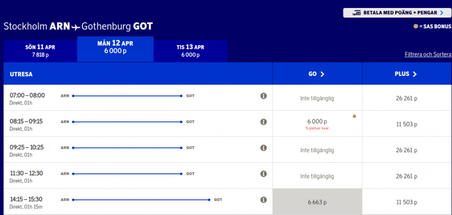I det här fallet så bokade jag faktiskt en "revenue" biljett för poäng, då skillnaden var så liten (6600p vs 6000 plus ca 290kr I avgifter), i pengar kostade biljetten 759.
