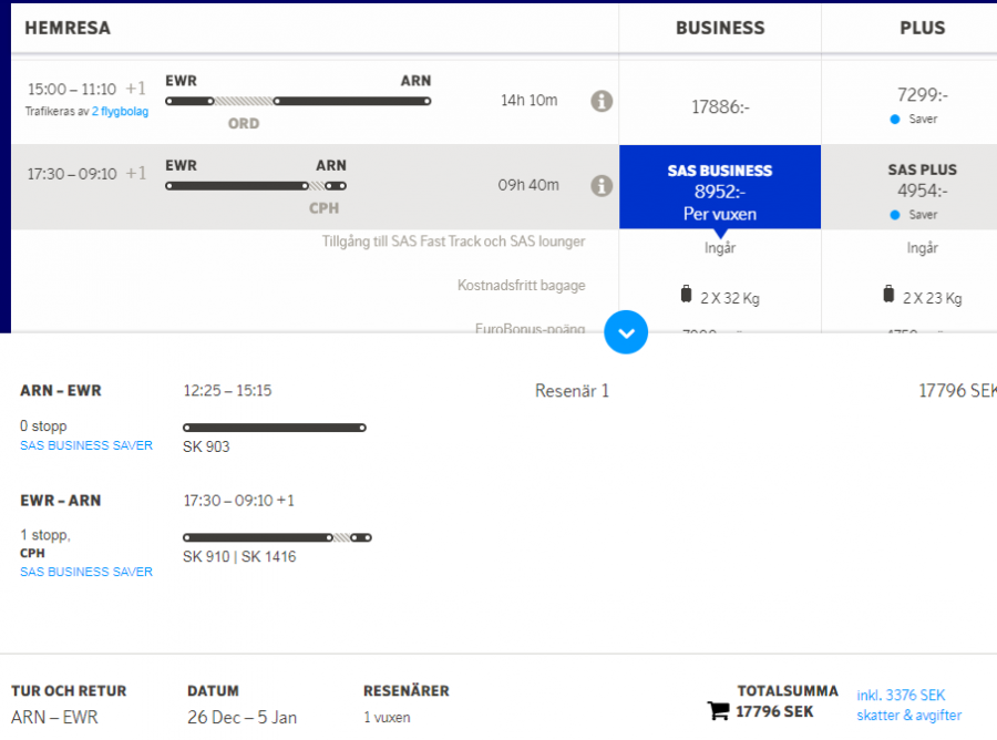 Vid sökning av Newark->Stockholm 2018-01-05: