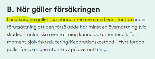 den även täcker din egen bil vid resor (då krävs det övernattning)